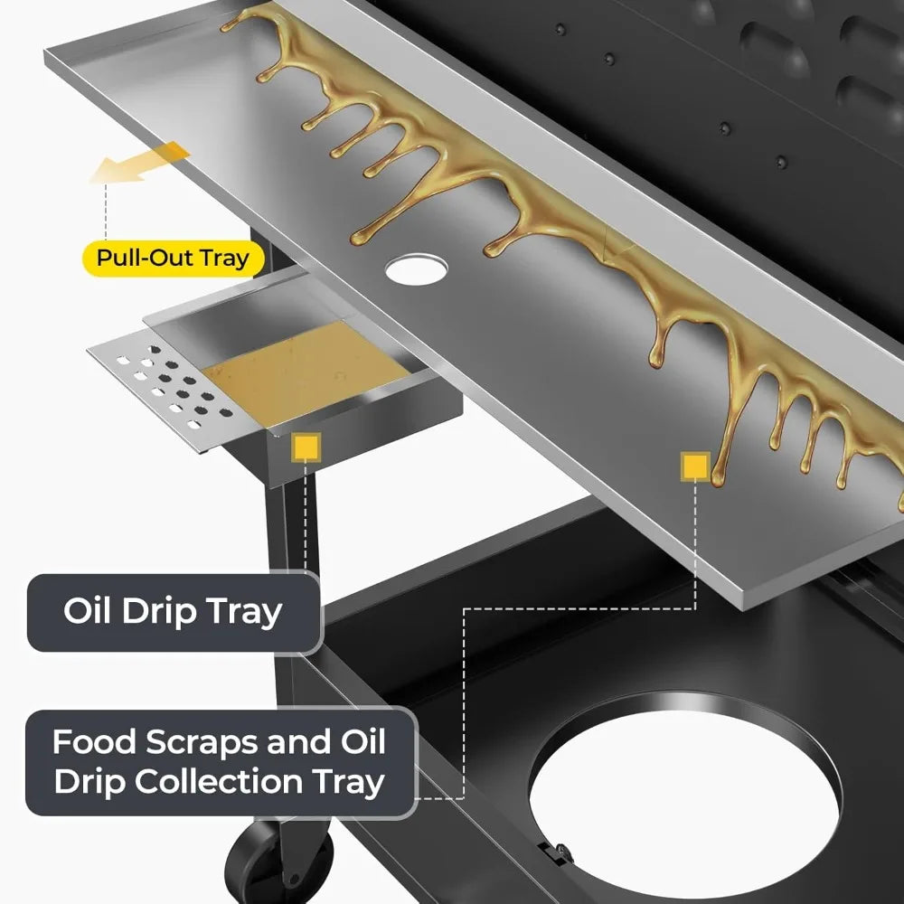 Experience professional grilling anywhere with this high-performance 3-burner propane gas grill. Featuring a powerful total output of 34,000 BTUs from three main burners (8,000 BTUs each) and an additional side burner (10,000 BTUs), this grill heats up quickly and distributes heat evenly for perfect results every time. The spacious cooking area offers 326.65 square inches of grilling space plus 124.80 square inches on the side burner, allowing you to cook multiple dishes simultaneously—ideal for family gatherings, camping trips, or backyard parties. Constructed from durable 304 stainless steel throughout, including the cooking surfaces and main body, this grill is rust-resistant, easy to clean, and built to last. The food-grade stainless steel grill pan ensures safe cooking while providing excellent heat conductivity. Enjoy versatile cooking options with three methods available: grilling on the main surface, frying on the grill pan, or boiling using the side burner. Designed for convenience and mobility, the grill includes four swivel casters (two with brakes) for smooth movement and stable positioning on any terrain. A removable grease drip tray and food residue collector make cleanup effortless after use. Additional features enhance functionality: a built-in thermometer for precise temperature control, side hooks and towel racks for utensil storage, a bottle opener for beverages, and ample under-grill storage for propane tanks or cooking tools. This multifunctional outdoor barbecue grill combines portability with professional-grade performance. Whether you're hosting a party or enjoying a camping adventure, it delivers fast heating, even cooking, and easy maintenance in a lightweight yet sturdy design. Upgrade your outdoor cooking experience today!