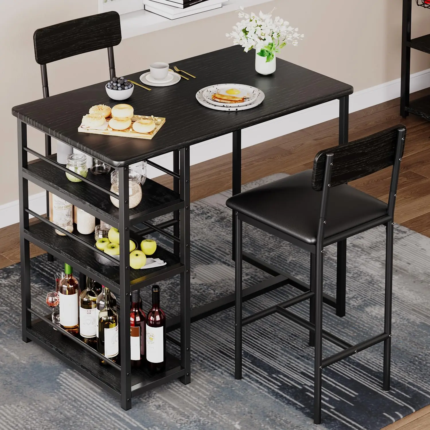3-Piece Bar Table and Chairs Set with 3 Tier Storage Shelves, with PU Cushion Bar Chairs