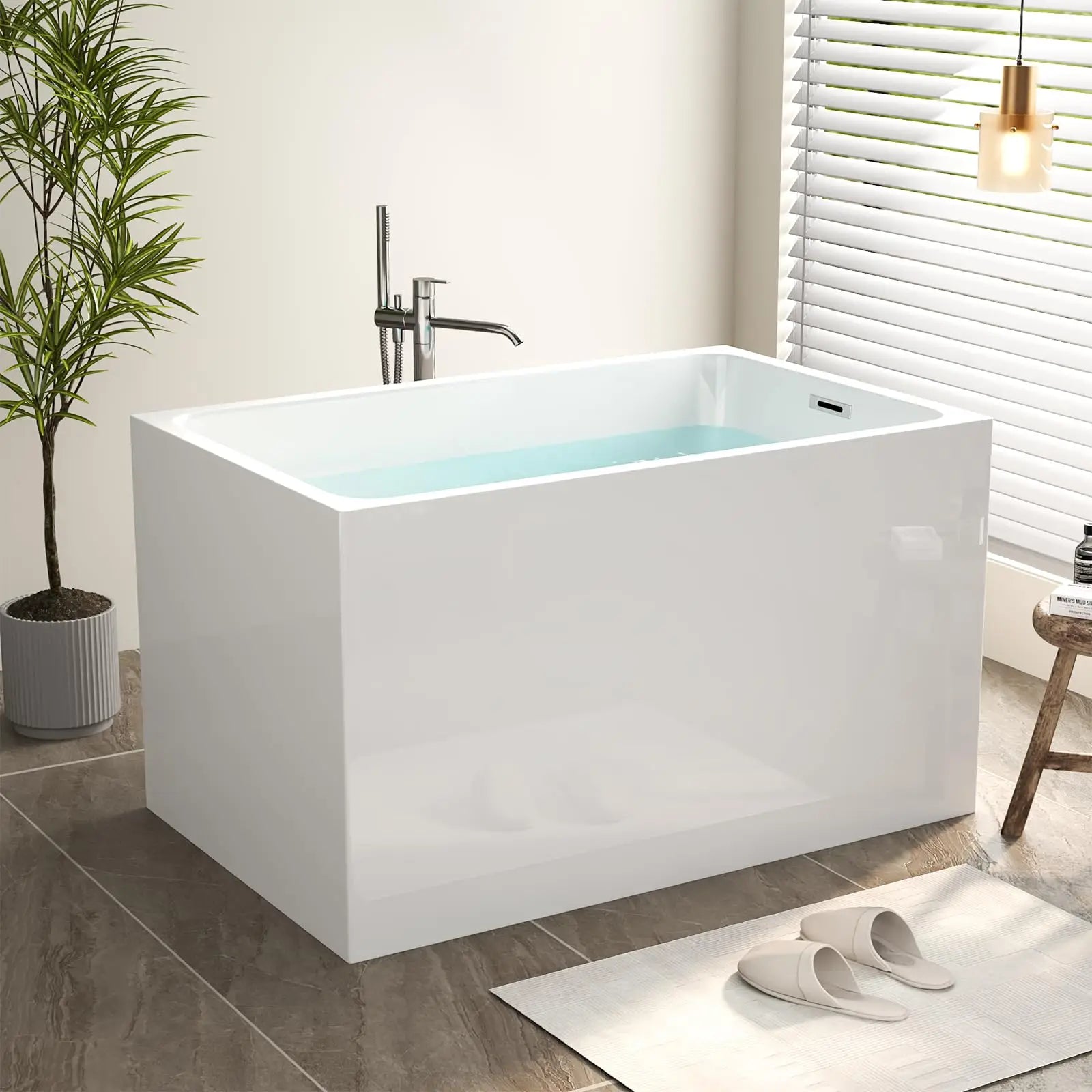 - Acrylic Bathtub with Built in Seat: This 43 inch freestanding bathtub has a built-in seat. The design is thoughtful and not only allows for relaxation while bathing, but also brings convenience to people with limited mobility