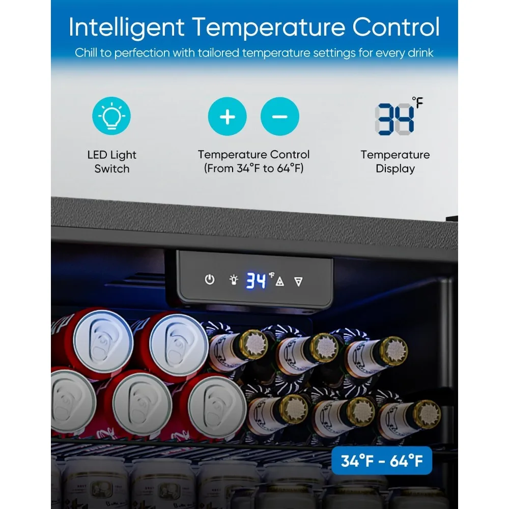 - Intelligent Temperature Management - Offering a wide temperature range (34°F to 64°F), this glass door mini fridge caters to your diverse storage needs. The intuitive digital display allows for precise temperature control. Keep your drinks at their ideal temperature, ready to serve at a moment's notice.
