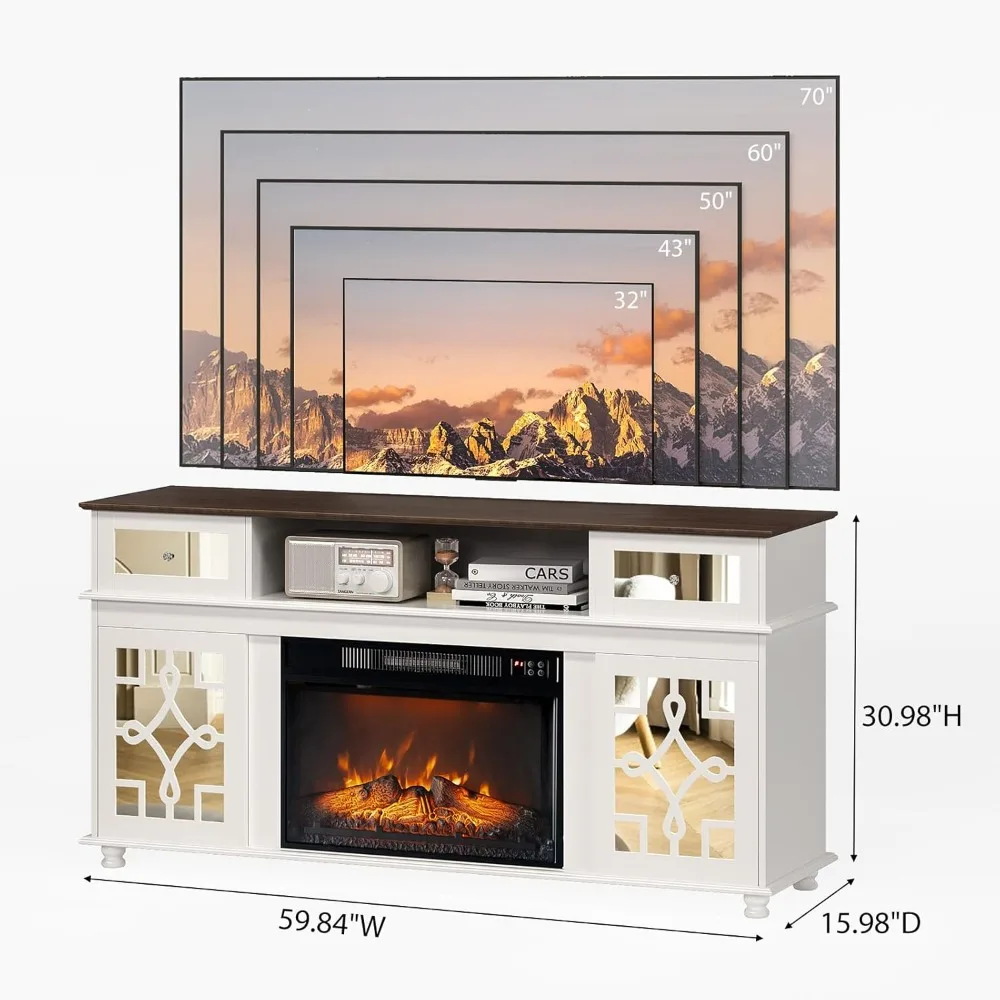 - Spacious and Functional Storage: With dimensions of 59.84"W x 15.98"D x 30.98"H, this Fireplace TV Stand with Mantel accommodates TVs up to 70" while offering ample storage with three adjustable shelves for books, electronics, and other essentials.