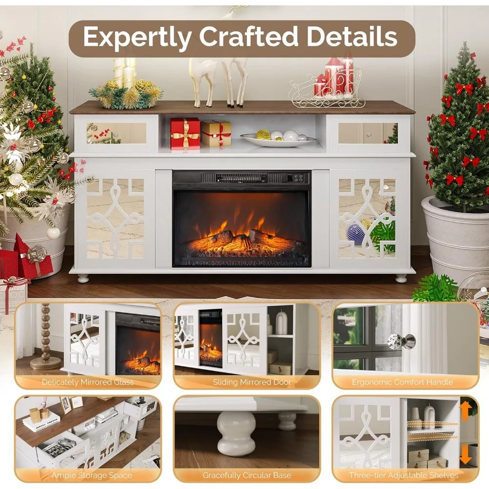 Fireplace TV Stand with Sliding Mirrored Door for TVs up to 70", Entertainment Center with Storage Cabinet and Shelves,