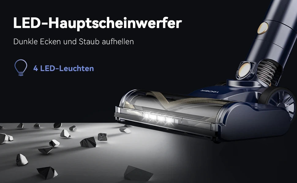 【23,000pa Suction Pussance & 600W Motor】With its 600W motor, the vacuum cleaner offers 23kpa of suction power. The vacuum cleaner with 6M cable eliminates frequent plug changes and gives you more durable, stable and powerful suction power that will not bother you anymore. Equipped with 4 LED lights and 80-105CM retractable metal tube for convenient height adjustment. Adapts to different surfaces, easy to clean on all types of floors.
