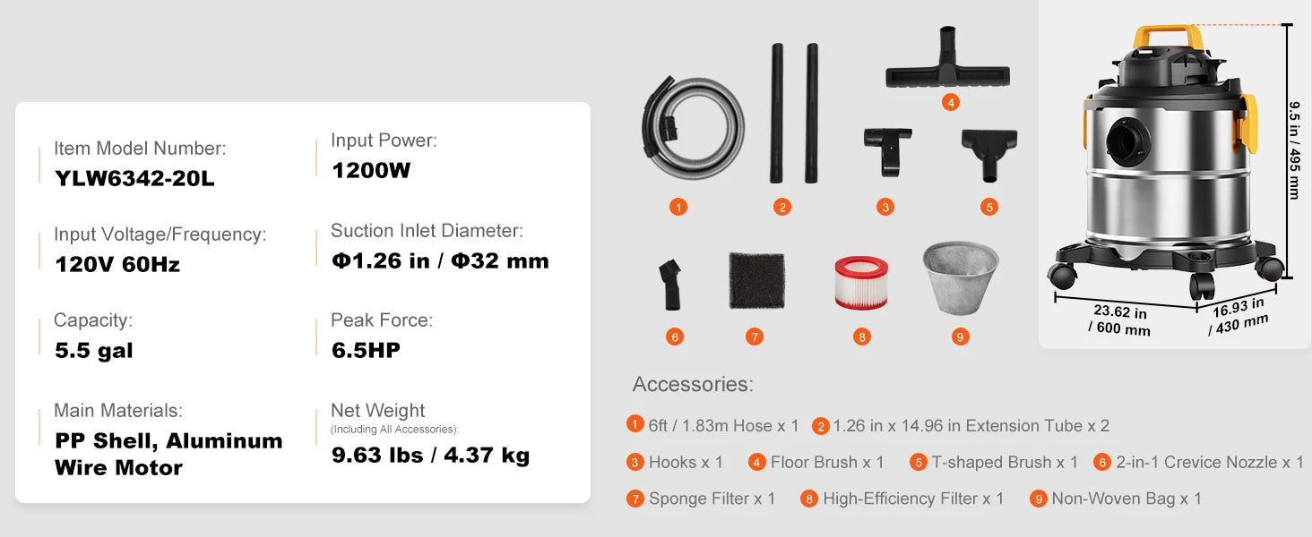 60CFM High Suction Power: Achieve unprecedented cleaning speed with our stainless steel vacuum cleaner boasting 60CFM suction and 6HP peak horsepower. It handles dust, debris, pet hair, and even indoor liquid spills effortlessly.