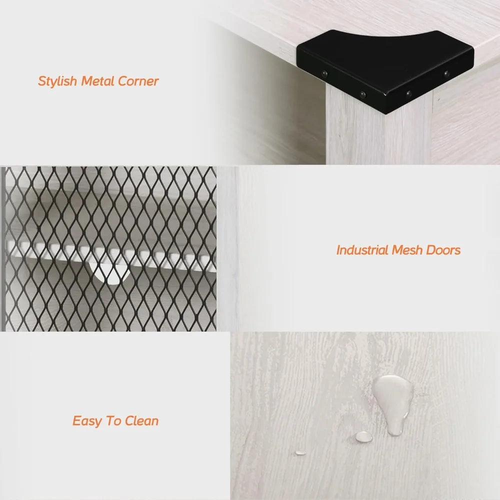 - 【Retro Design for Universal Compatibility】Embracing a timeless retro aesthetic, the furniture piece seamlessly integrates into a broad spectrum of interior styles.The decorative metal corner and iron mesh elements, with vintage white wood grain, make this end table more industrial retro.