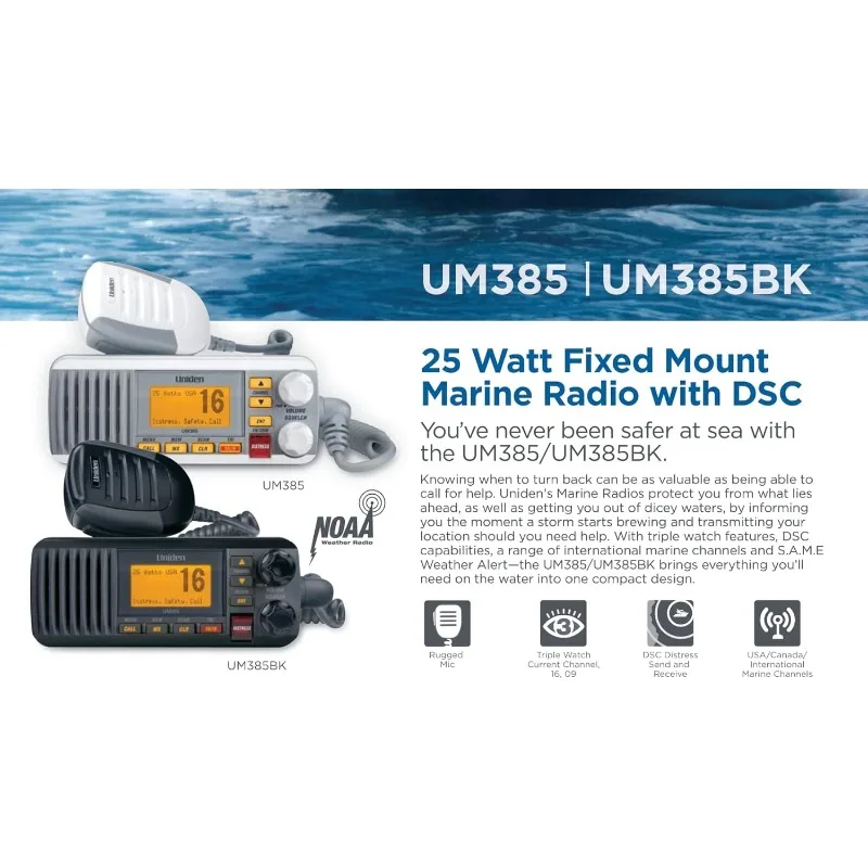 With triple watch features, DSC capabilities, a range of international marine channels and S. A. M. E Weather Alert—the UM385 brings everything you’ll need on the water into one compact design.