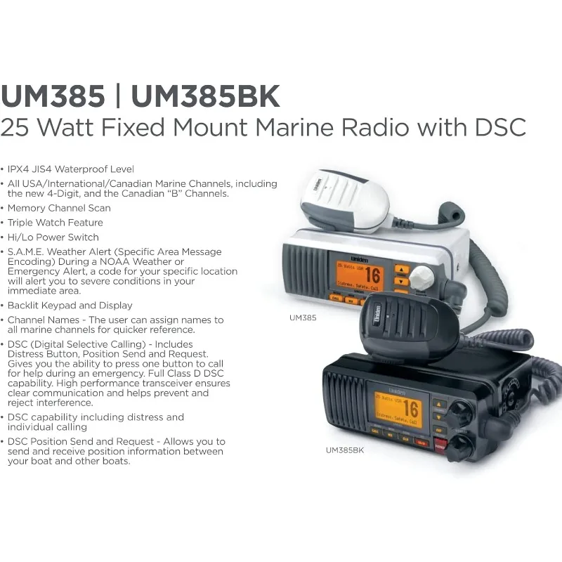 UM385 25 Watt Fixed Mount Marine Vhf Radio, Waterproof IPX4 With Triple Watch, Dsc, Emergency/Noaa Weather Alert